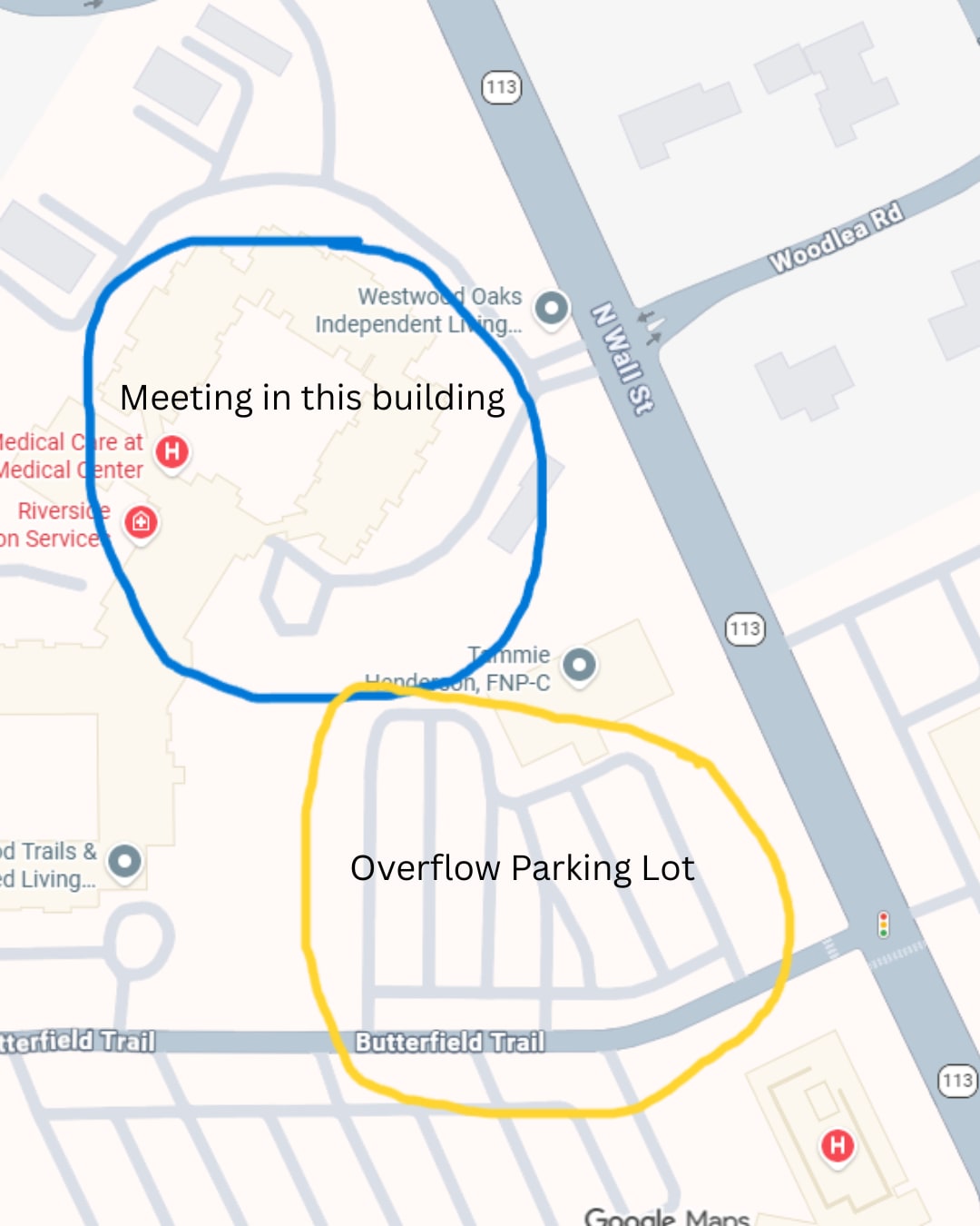 There will be overflow parking available at the Westwood Professional Building. There is a walk path to the enterance of the Riverside Senior Life Community building. Please see attached map for reference to overflow parking.