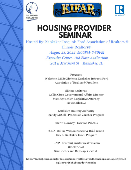 You are invited to KIFAR's Housing Provider Seminar. HB2775 was passed on May 24th and will go into effect January 1, 2023. This will change the way you screen tenants for Residential Rentals. Starting January 1, 2023 you will no longer be allowed to Source Income on rentals. Which means you can not deny someone housing based solely on Section 8 Vouchers. We have put together a program with our legal team from Illinois Realtors, The Kankakee Housing Authority, ECDA and Sheriff Downey to give you all the details. Sandwiches and water will be available. This is a free event. Share with your clients that are Housing Providers. Please register by Aug 19th so we know what to order for food.
