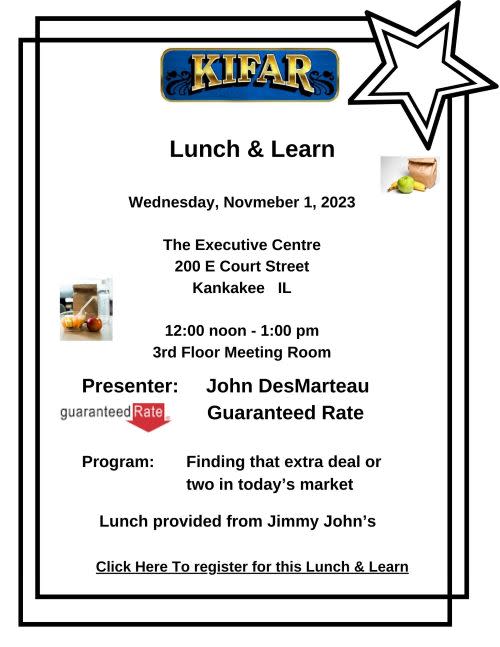 KIFAR Lunch & Learn scheduled for Wednesday, November 1st, 12:00 noon at the Executive Centre, 3rd Floor Meeting Room, 200 E Court Street, Kankakee.